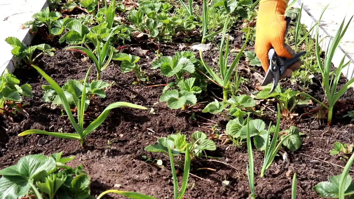 Весняний догляд ми починаємо зі збирання гряд та обрізки кущів полуниці. У першу чергу, видаляємо сухе торішнє листя, яке легко відрізнити на вигляд від молодих, тільки початківців з'являтися на кущах. Минулорічні листя - це основний розсадник хвороб і місце зимівлі різних шкідників. Прибравши їх, ми суттєво полегшуємо собі завдання щодо збереження врожаю та посадок загалом.