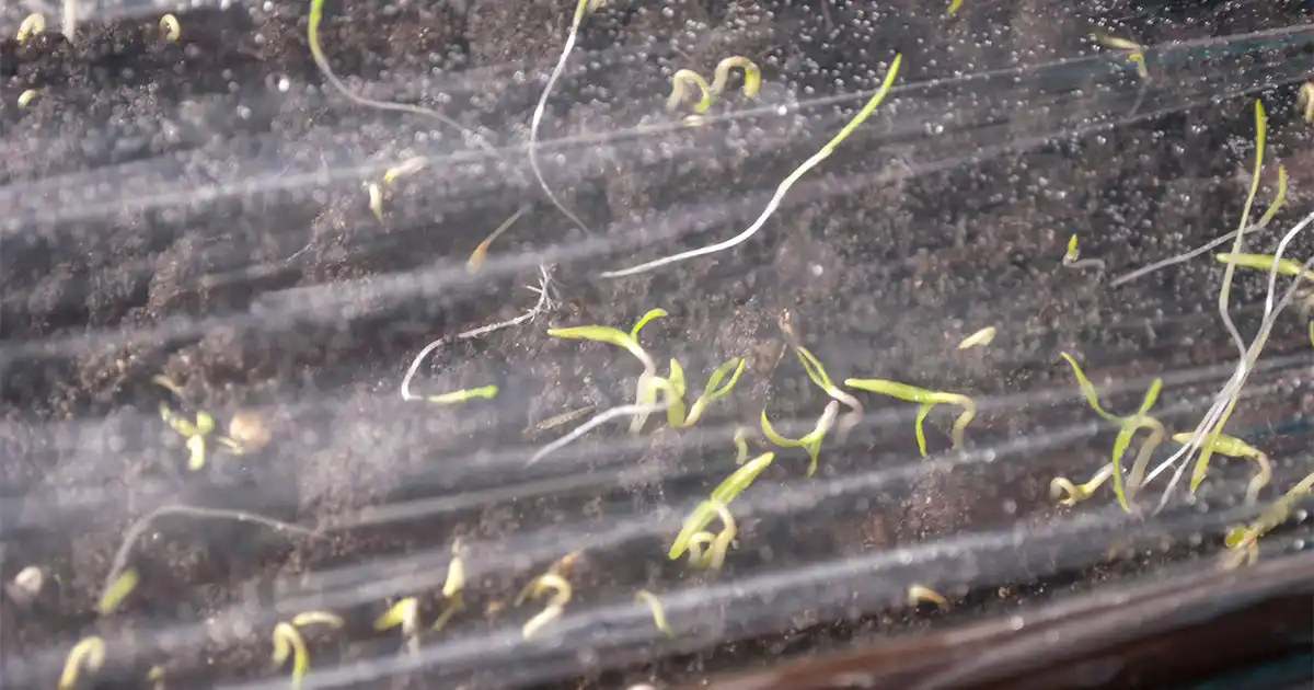 Ємності накриваємо прозорим матеріалом – склом, пластиком, плівкою та прибираємо у тепло (23-25 градусів). Періодично потрібно провітрювати та зволожувати ґрунт під укриттями.