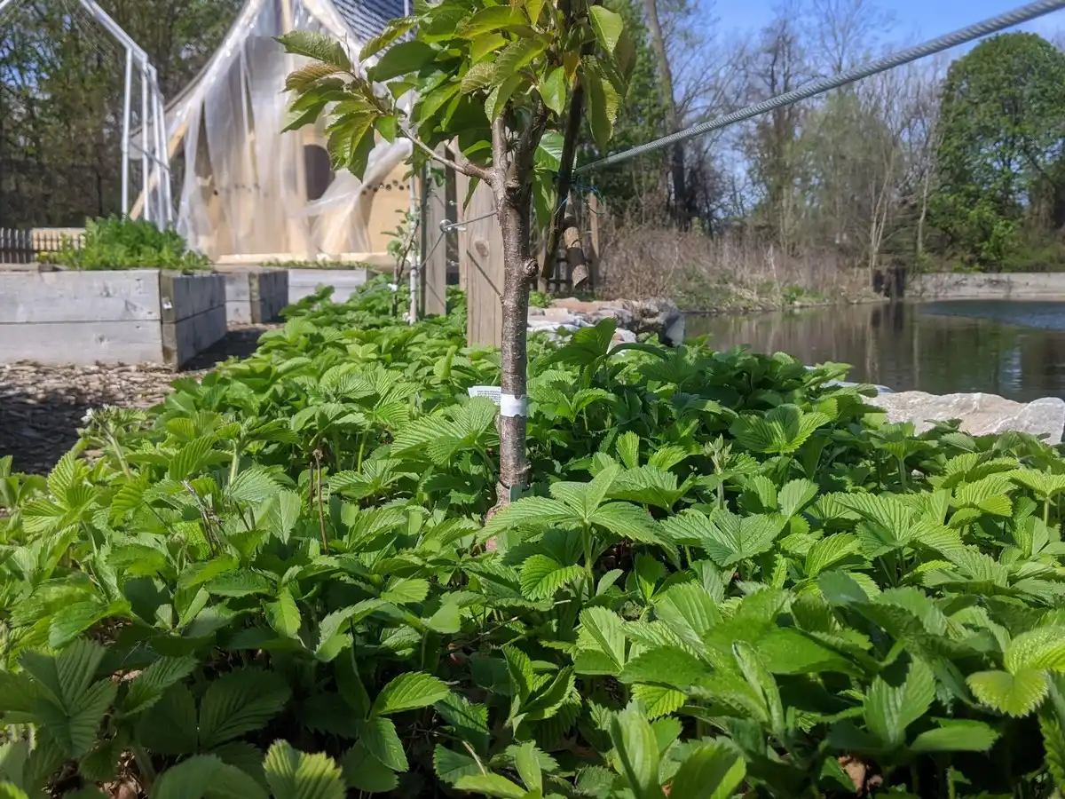 Також цей варіант ідеальний, якщо на ділянці є сад. Суниця може допомогти дереву, забезпечуючи хороший ґрунтовий покрив. Але й дерево також зі свого боку допоможе полуниці. Цвітіння дерева дуже добре приваблює запилювачів, тому корисні комахи обов'язково прилетять, коли вони знадобляться суниці.