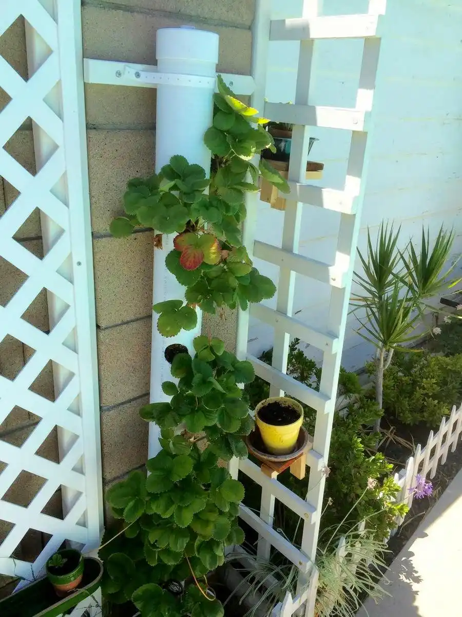 Зробіть 3 ряди отворів у широкій трубі у шаховому порядку по вертикалі на відстані 20 см один від одного, далі просвердліть дрібні отвори у вузькій трубі. Оберніть вузьку трубу геотекстилем і вставте в широку трубу, засипте широку трубу ґрунтом і висадіть у бічні отвори рослини. У спеку потрібно буде поливати конструкцію щодня. Через кілька місяців труби буде майже не видно. А коли вуса відростуть, така грядка нагадуватиме фото з рекламних буклетів про полуницю, що «вивається».