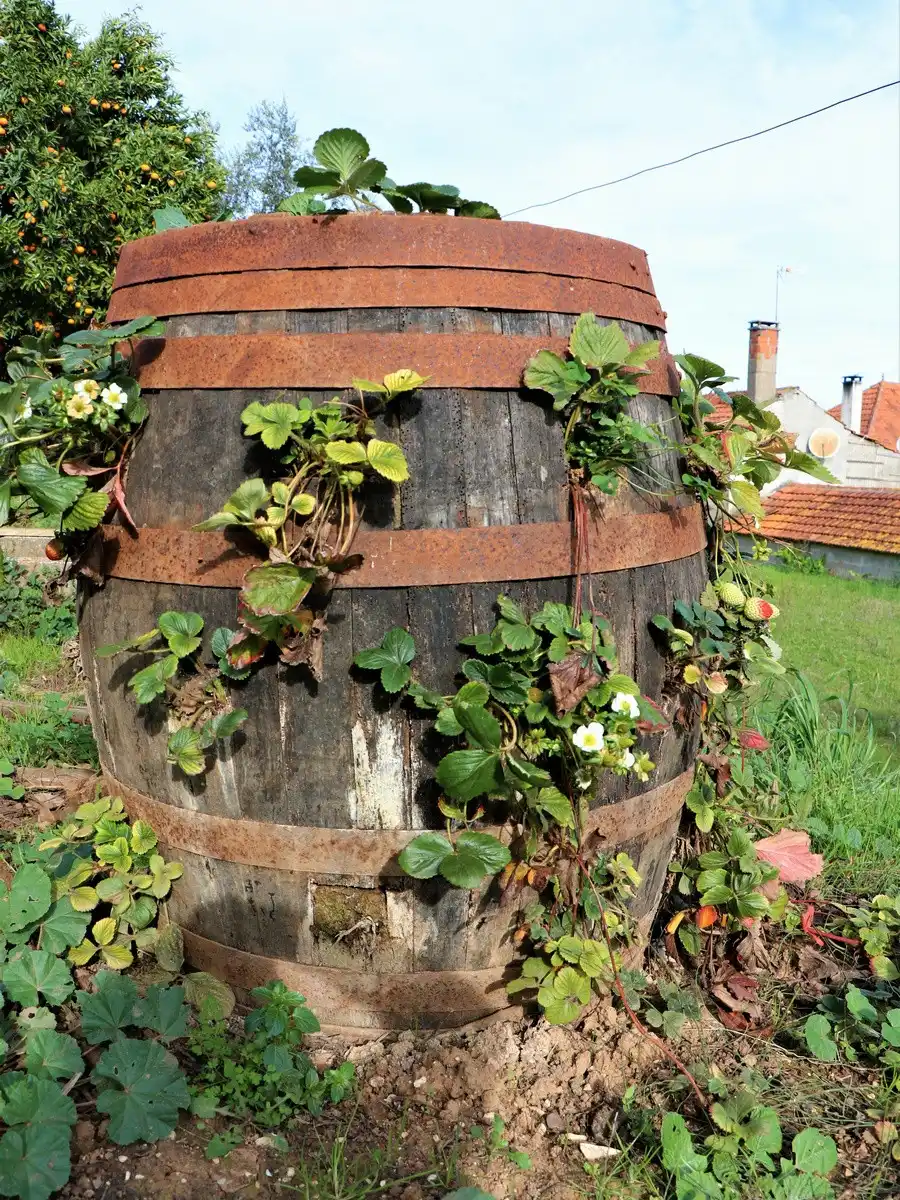 Щоб не купувати готової конструкції, можна використовувати для посадки полуниці стару бочку. Для цього використовується стара пластикова або дерев'яна бочка цілком, або потрібно розрізати її навпіл, щоб зробити пару кашпо, або відпиляти одну до потрібної висоти і посадити рослини зверху.