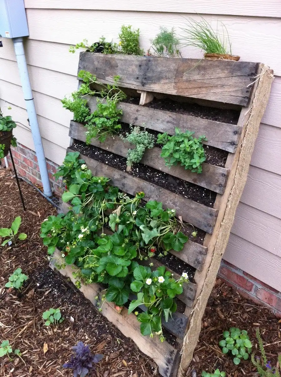 Піддони, або палети – дешеві та міцні, їх можна використовувати для створення грядки під полуницю. Вони засипаються ґрунтом, а в щілини висаджуються рослини, щоб ґрунт тримався краще. Часто внутрішню частину палет вистилають нетканим матеріалом, який фіксують степлером, і вже після цього в отвори висаджується суниця. Після цього зазвичай конструкція тулиться до стіни, але іноді прикручується болтами для кращої фіксації.
