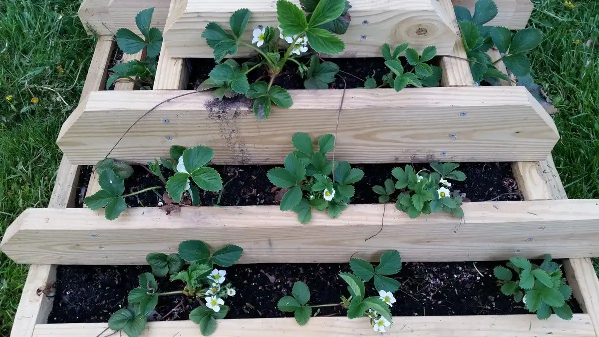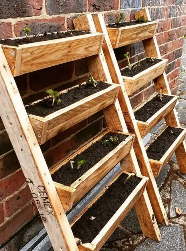 Ця цікава конструкція підходить не тільки для вирощування суниці, але й для овочів та зелені. Для виготовлення «полуничних сходів» необхідно випиляти два ступінчасті бічні елементи сходів із міцного матеріалу. Після цього до двох деталей шурупами прикріплюються балконні ящики, які утворюють щаблі. Коли сходи будуть готові та розміщені на постійному місці, просто заповніть ящики відповідним ґрунтом та обраними рослинами.