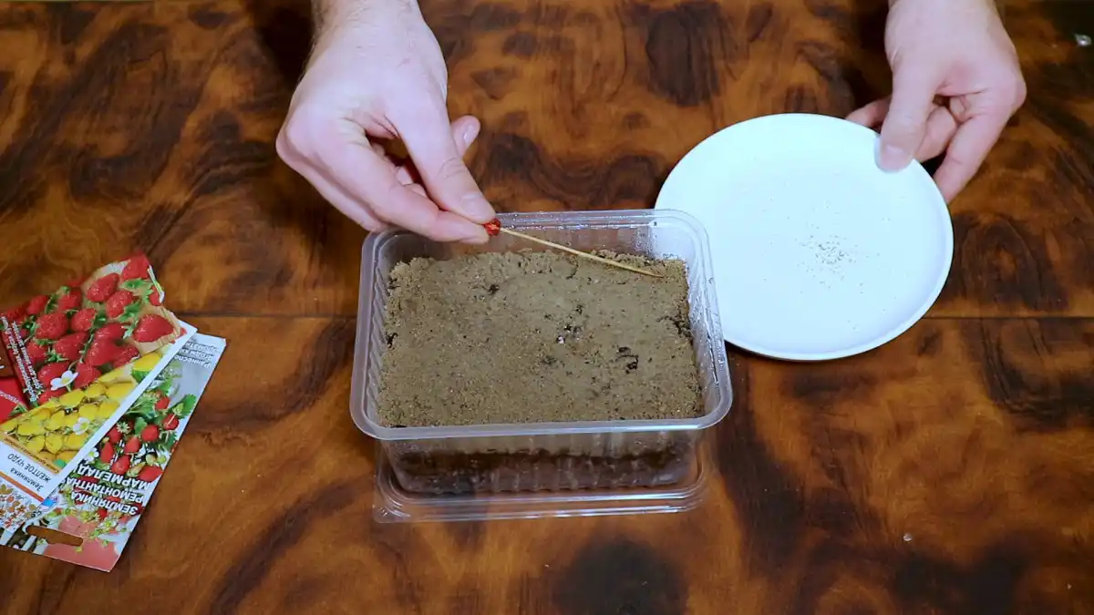 - Шпажкою, змоченою у воді, беріть насіння зі блюдця і переносіть у контейнер.