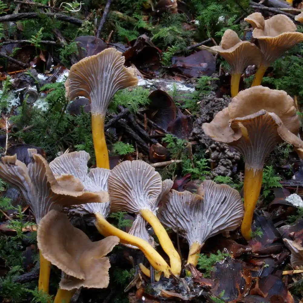 Інший варіант проміжної категорії між чорною та жовтою лисичками — лисичка жовтіє (Craterellus lutescens). У цього гриба коричнево-жовтувата капелюшок лійкою і яскрава руда ніжка. У молодих грибів гіменофор (зворотний бік капелюшка) мало складчастий, з віком зморшкуватість наростає. Зустрічається помітно рідше за попередні види у хвойних лісах із серпня по вересень. Менш смачна.