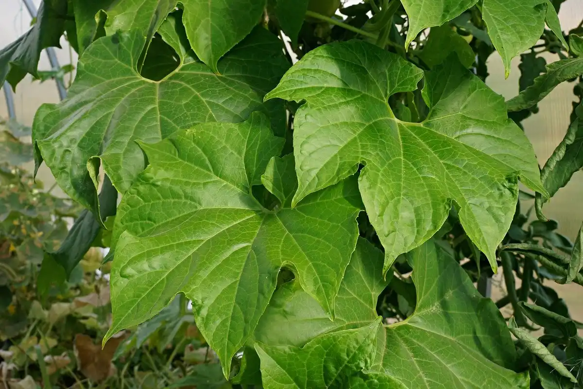 Росте у вигляді довгих лоз, що швидко ростуть, які вимагають міцної опори. У себе на батьківщині стебла можуть досягати 15 м завдовжки. Стебло товсте, борозенчасте, для лазіння на ньому є вусики довжиною 9-11 см. Листові пластинки до 30 см в діаметрі глибоко виїмчасті біля основи, трилопатеві, з хвилястими або зубчастими краями, на довгих черешках. Верхня поверхня листа темно-зелена, трохи блискуча, гола.