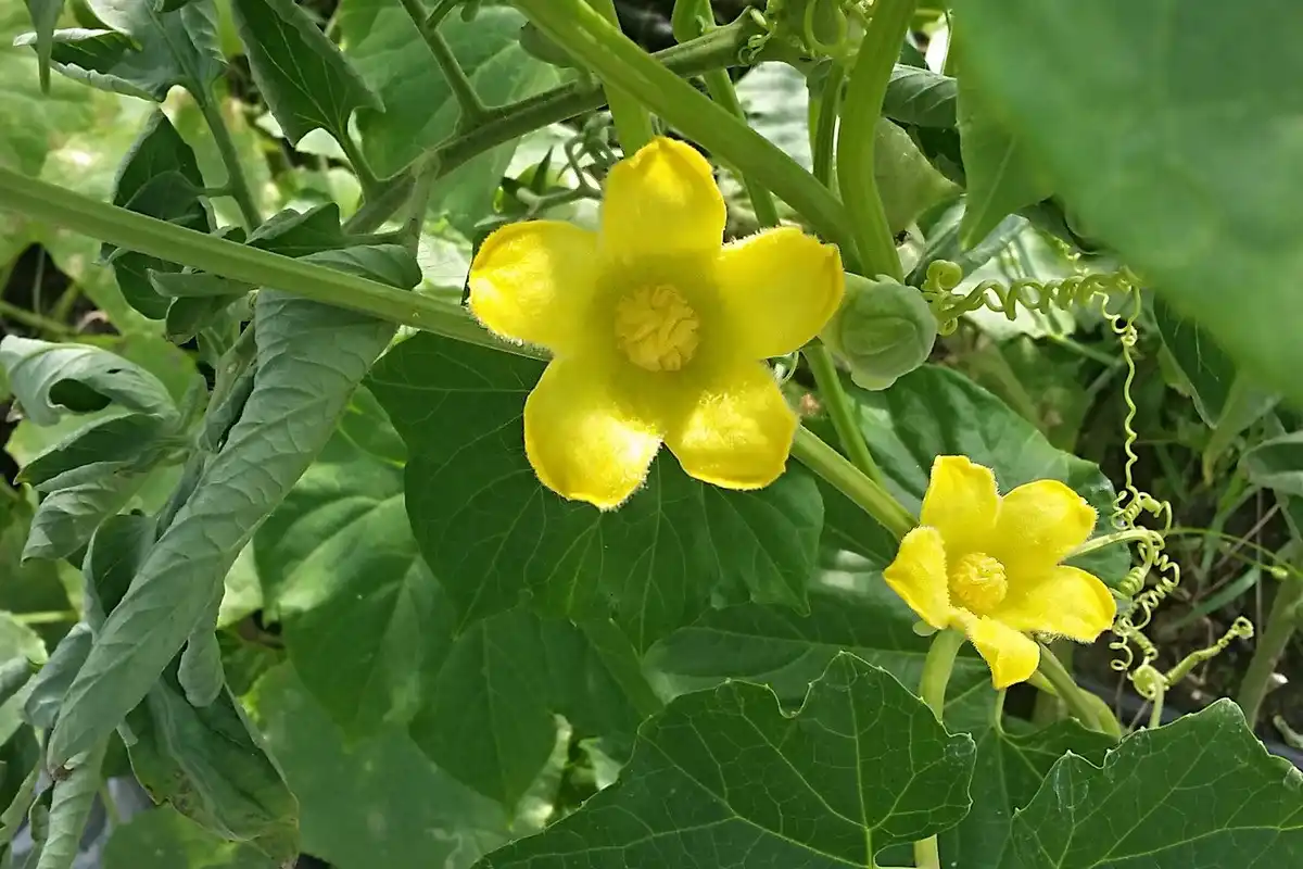 На початку серпня я виявила на ліані багато бутонів. Деякі городники скаржаться, що касабанана у них у теплиці не цвіте, а лише нарощує батоги. Не знаю, чому мені так пощастило, можливо, причина була у надзвичайно спекотному літі, але наприкінці літа на моїй ліані розкрилося безліч квіток. Вони були невеликого розміру (не більше 4 см в діаметрі), за кольором зеленувато-жовті, складалися з 5 пелюсток, що округляють, а всередині мали виразні тичинки. Пелюстки були товстими і матовими через опушення, могло здатися, що вони зроблені з воску.