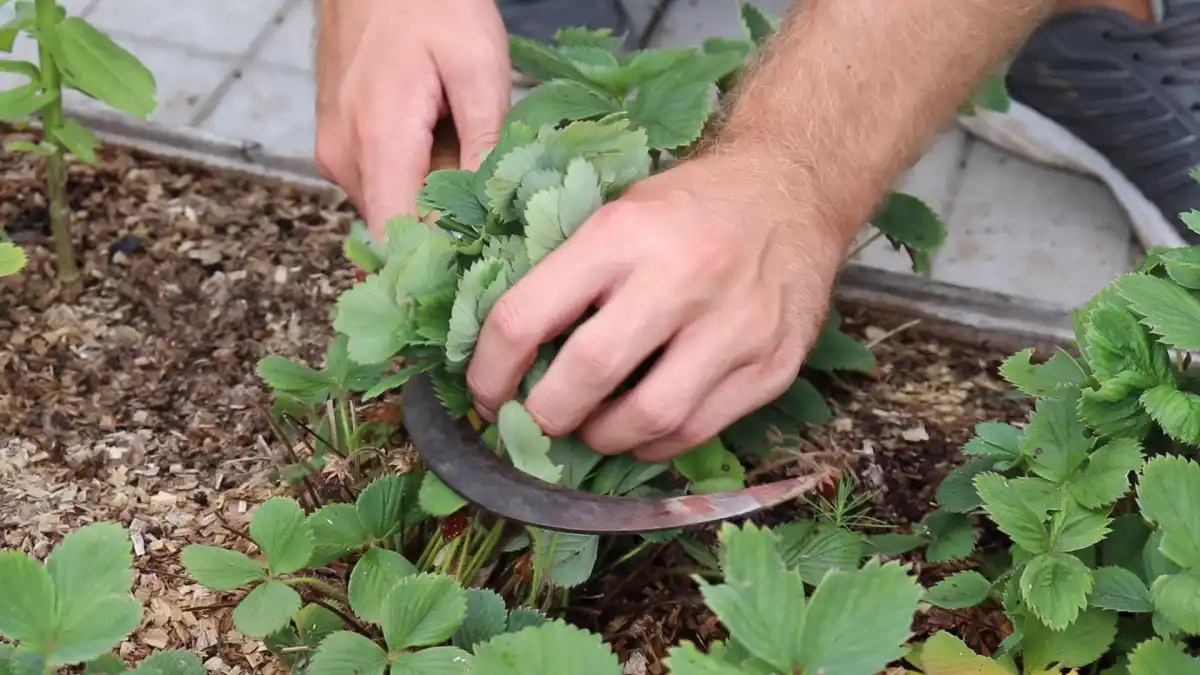 Коли на грядці росте кілька кущів полуниці, то зрізати їх листя не складе труднощів. Але що робити, якщо на городі ціла полунична плантація? Піде багато часу на обробку такої ділянки. Є досить простий спосіб вирішити проблему. Для видалення листя використовуйте серп. Просто захопіть повністю все листя куща і зріжте його серпом. Працюйте обережно, щоб не пошкодити руки.