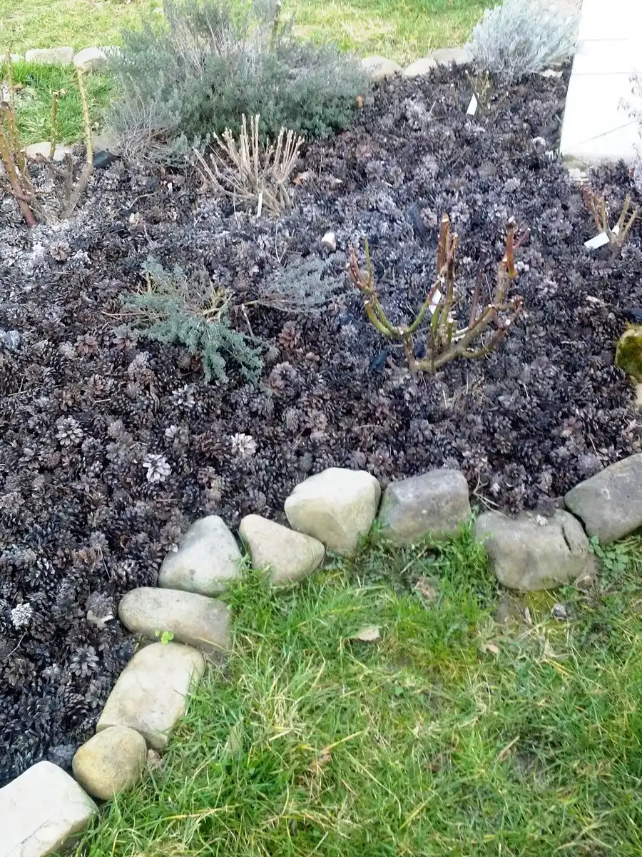З рожевими клумбочками трохи інакше: викопуємо ямки і висаджуємо рожеві кущики, весь простір навколо застилаємо папером у кілька шарів або картоном і засипаємо травою. Після підсихання трави укладаємо зверху соснові шишки, постачальником яких є доросла сосна, що росте на ділянці. Протягом сезону все в такому вигляді залишається.