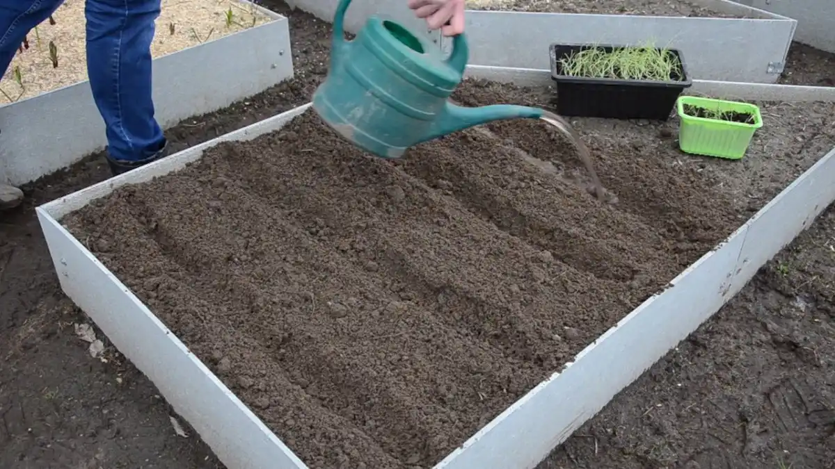 - Повністю закласти посаджені цибулини ґрунтом. Потім добре пролити всю грядку.