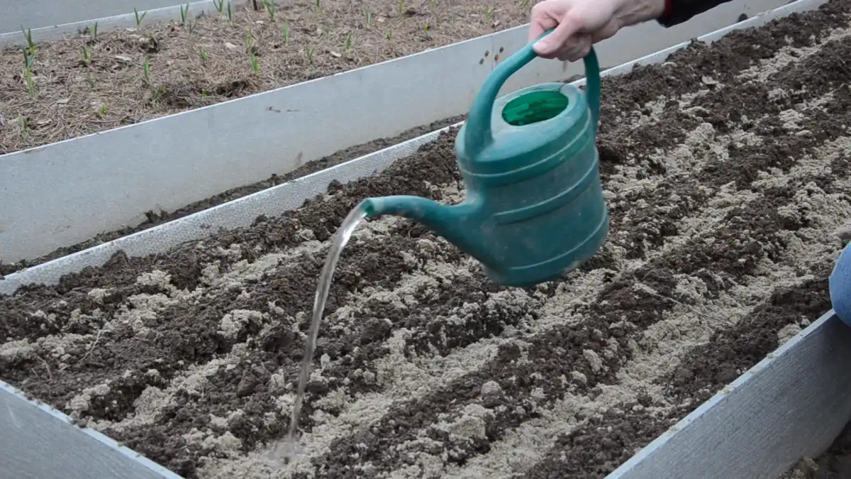 4. Полити посадки водою. Борозни з добривом, піском та насінням потрібно добре пролити водою. Бажано після цього присипати канавки сумішшю золи та тютюнового пилу, взятими у пропорції 1:1. Тютюновий пил стане профілактикою від шкідників. Зола - це натуральний, корисний засіб для рослин 3-в-1. Вона служить добривом, знижує кислотність ґрунту та захищає від паразитів.
