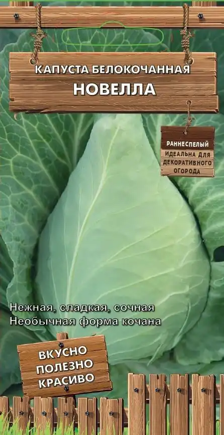 Сорт «Новела» привертає увагу незвичайною конусоподібною формою качана, саме тому вона була включена до серії «Декоративний город». Від висадки розсади до технічної стиглості – 62-70 днів. Качан середньої щільності, масою до 1,5 кг, відрізняється ніжною структурою, соковитістю, високим вмістом вітамінів, мінеральних солей та мікроелементів. Ідеальний для свіжих салатів та домашньої кулінарії.
