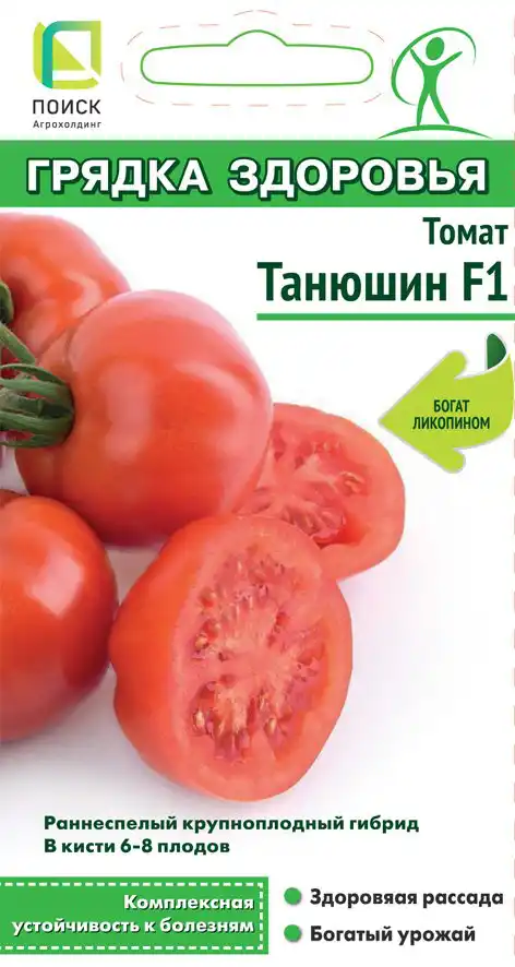 Томат «Танюшин» F1. Цей великоплідний високоврожайний гібрид лідер за кількістю лікопіну (8,1 мг на 100 г), що дозволяє знижувати ризик серцевих захворювань та раку.