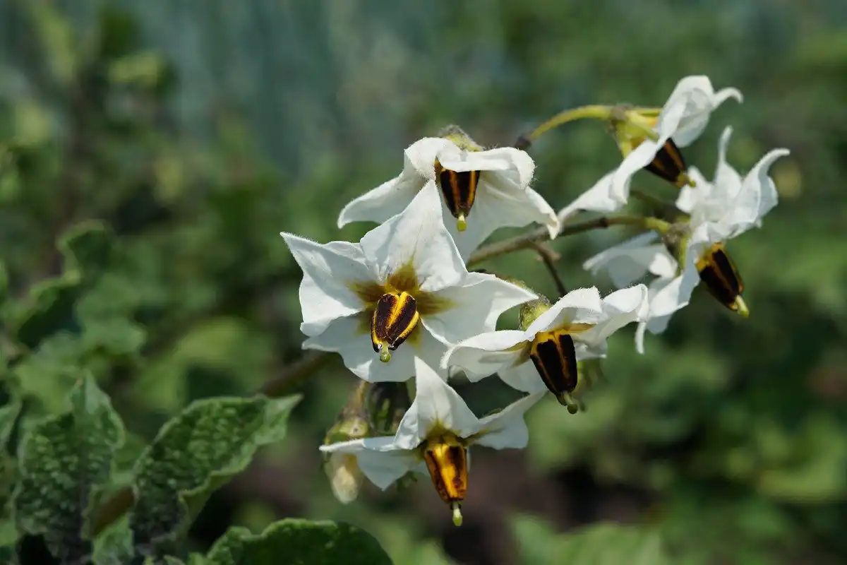 Коли «Чудесник» зацвів, він ще більше здивував мене. Пелюстки його квіток були кристально білими, а тичинки, зібрані у вигляді конуса, мали чорно-жовті смужки. Складалося враження, що на квітку присіла бджола, при цьому біля основи тичинок на пелюстках була велика коричнево-жовта зірка. Хоча нерідко рекомендується обривати суцвіття біля квітучої картоплі, мені було шкода зривати подібну красу, а цвіла синя картопля дуже рясно.