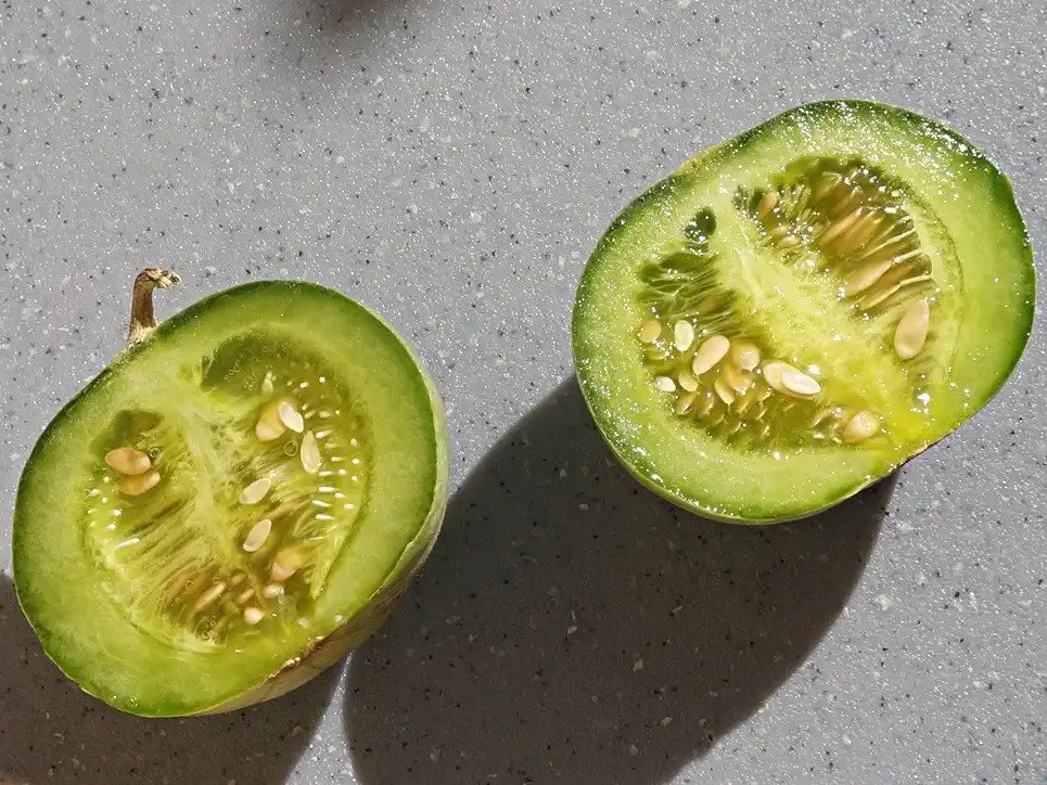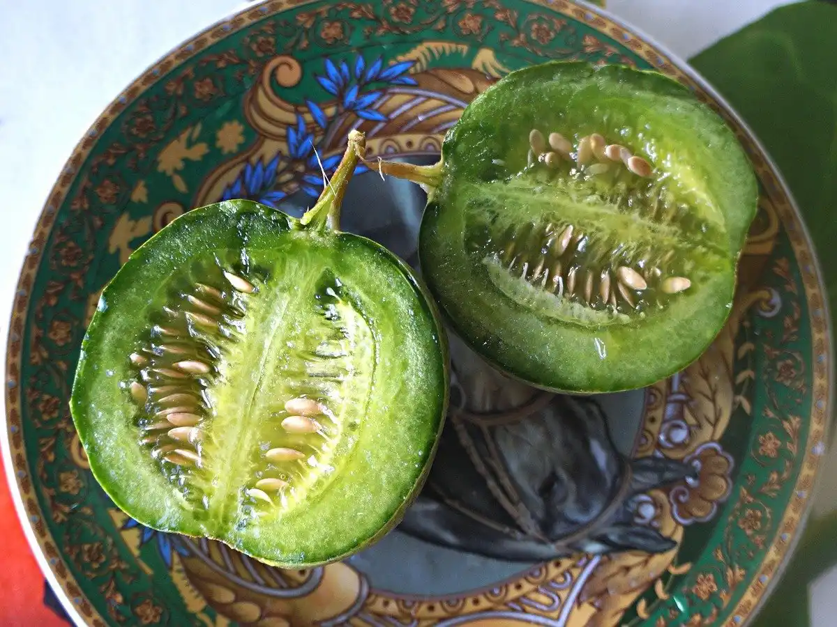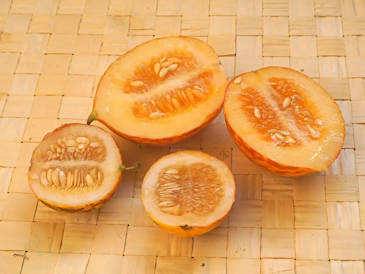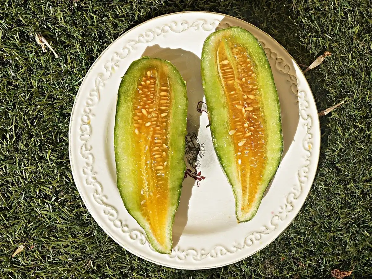 Усередині така огірка виглядає дуже ошатно і нагадує якийсь екзотичний фрукт: усередині насіннєвої камери яскраво-оранжеве «желе» з насінням, сама м'якоть зеленувато-жовта, а біля шкірки вона стає яскраво-зеленою. При розрізанні відчувається сильний приємний аромат, шар їстівної м'якоті приблизно 1,5 сантиметра. По консистенції м'якоть розсипчаста і дуже солодка на смак, з незвичайним приємним смаком.