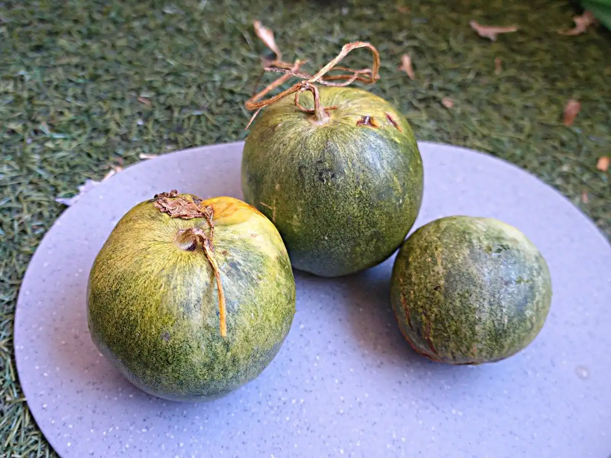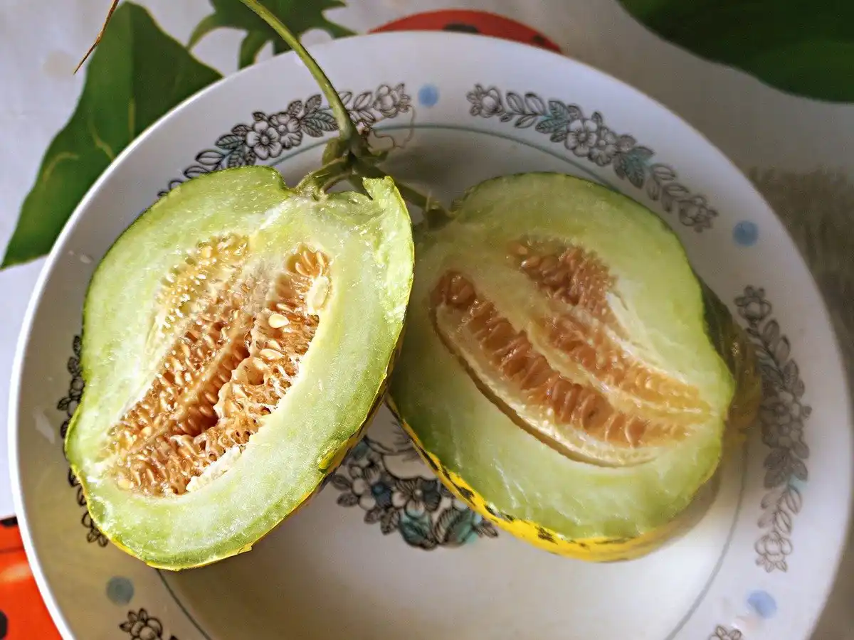 Забарвлення смугасте, у плодів, що повністю визріли, коричневі смужки. М'якуш у цих крихітних диньках виявилося зовсім мало, але цей недолік можна було б пробачити, якби вона мала приємний і солодкий смак. Але, на жаль, навіть плоди, що максимально визріли під спекотним сонцем, були прісними, без будь-якого натяку на солодощі.