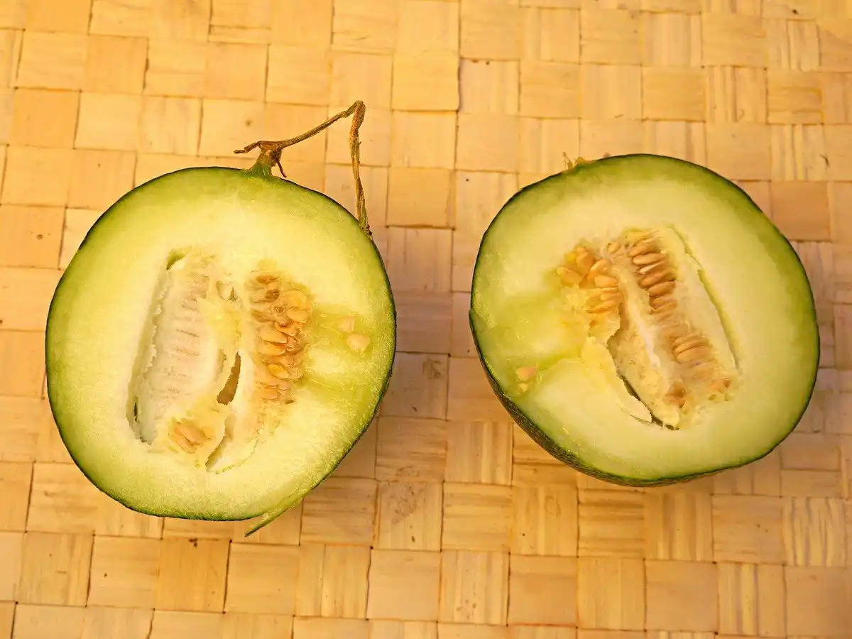 Коли я наважилася спробувати "Грін Бьюті", виявилося, що ні перше, ні друге не відповідає дійсності. Навіть при повному визріванні м'якоть цієї огудині зберігає незвичайний яскраво-зелений колір. Смак же, незважаючи на недостиглий вигляд, був просто дивовижний, дуже солодкий, динний і злегка терпкуватий. Особисто мені до смаку вона нагадала популярну ребристу диню «Ефіопку», а виробник характеризує її аромат як мускусну диню «Канталупа», що нагадує.