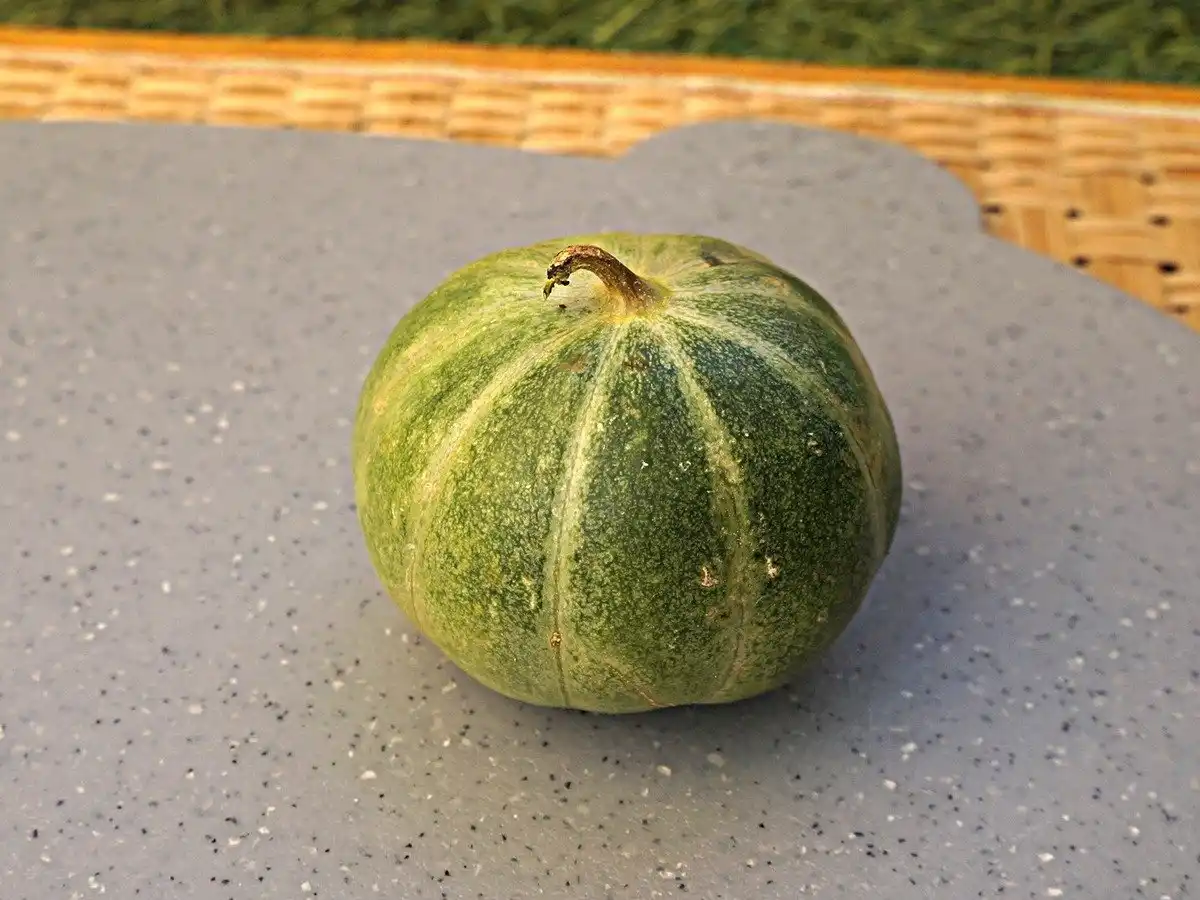 Зовнішність плодів також не зовсім відповідала зображеній на пакетику з насінням. На малюнку диньки були неребристими, забарвлення темно-зелене зі світлими смужками. Мій же врожай був дуже симпатичні досить ребристі плодики зеленувато-блакитного кольору зі світлими смужками вздовж ребер.