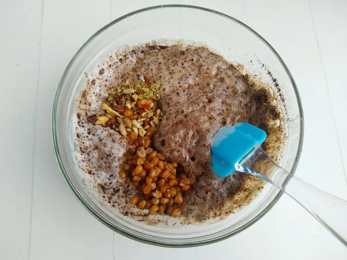 Додати пшеницю, насіння та горіхи, перемішати.