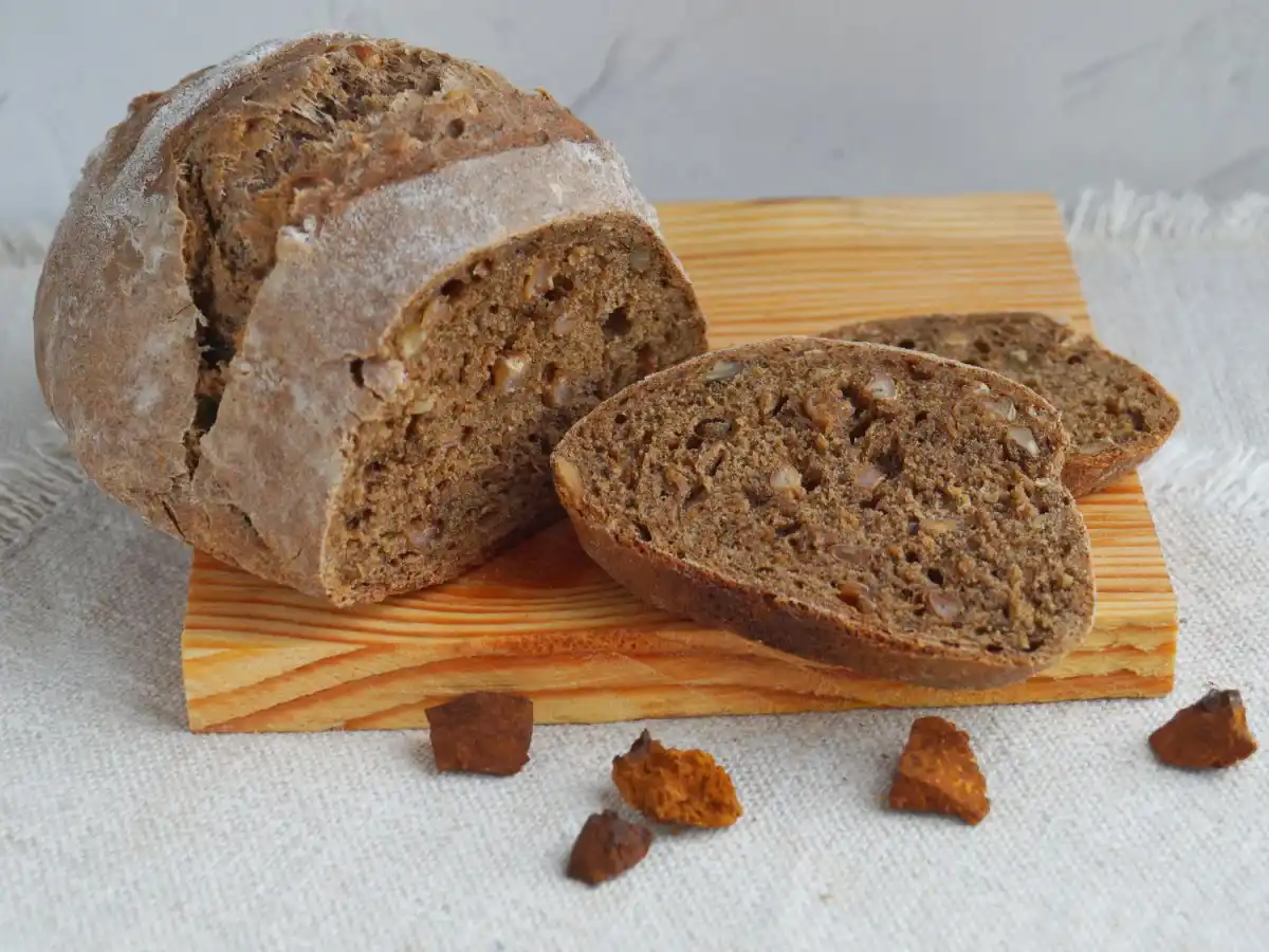 Хліб готується на основі борошна пшеничного з додаванням порошку з подрібненої чаги. У складі чаги є речовина бетулін, яка допоможе схуднути та оздоровити організм. Хліб замішується без дріжджів, з корисними добавками насіння та горіхів. Склад та пропорції горіхів можна варіювати. Пшеничне борошно можна замінити на безглютеновий аналог. Для рецепту підійде будь-який кисломолочний напій на ваш вибір – кефір, кисле молоко, йогурт або ряжанка. Для вегетаріанської версії можна використовувати соєве, горіхове молоко чи рослинний йогурт.