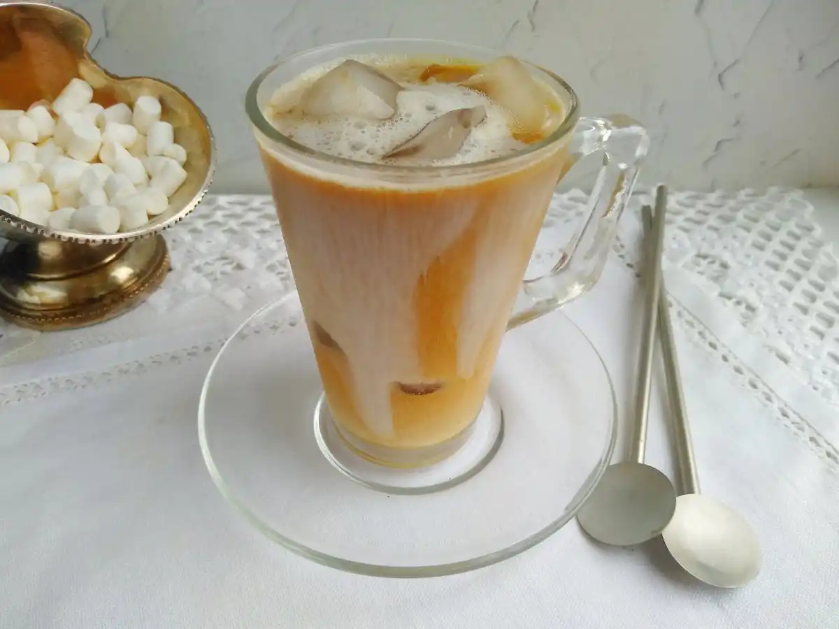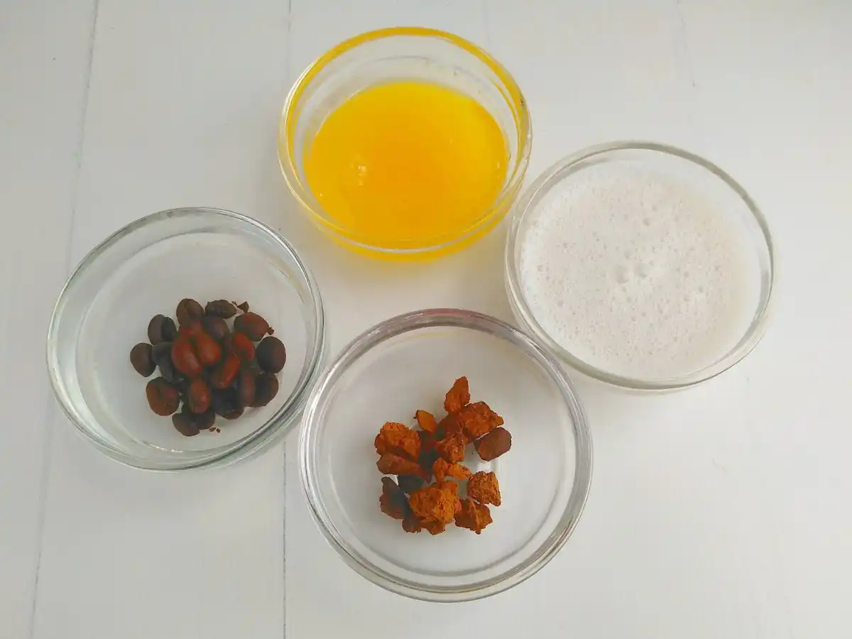 Кавовий напій з чаги відмінно тонізує і бадьорить у спекотний літній день. Для рецепту ідеальна добавка з мигдального молока, яку можна замінити на вершки чи коров'яче молоко.