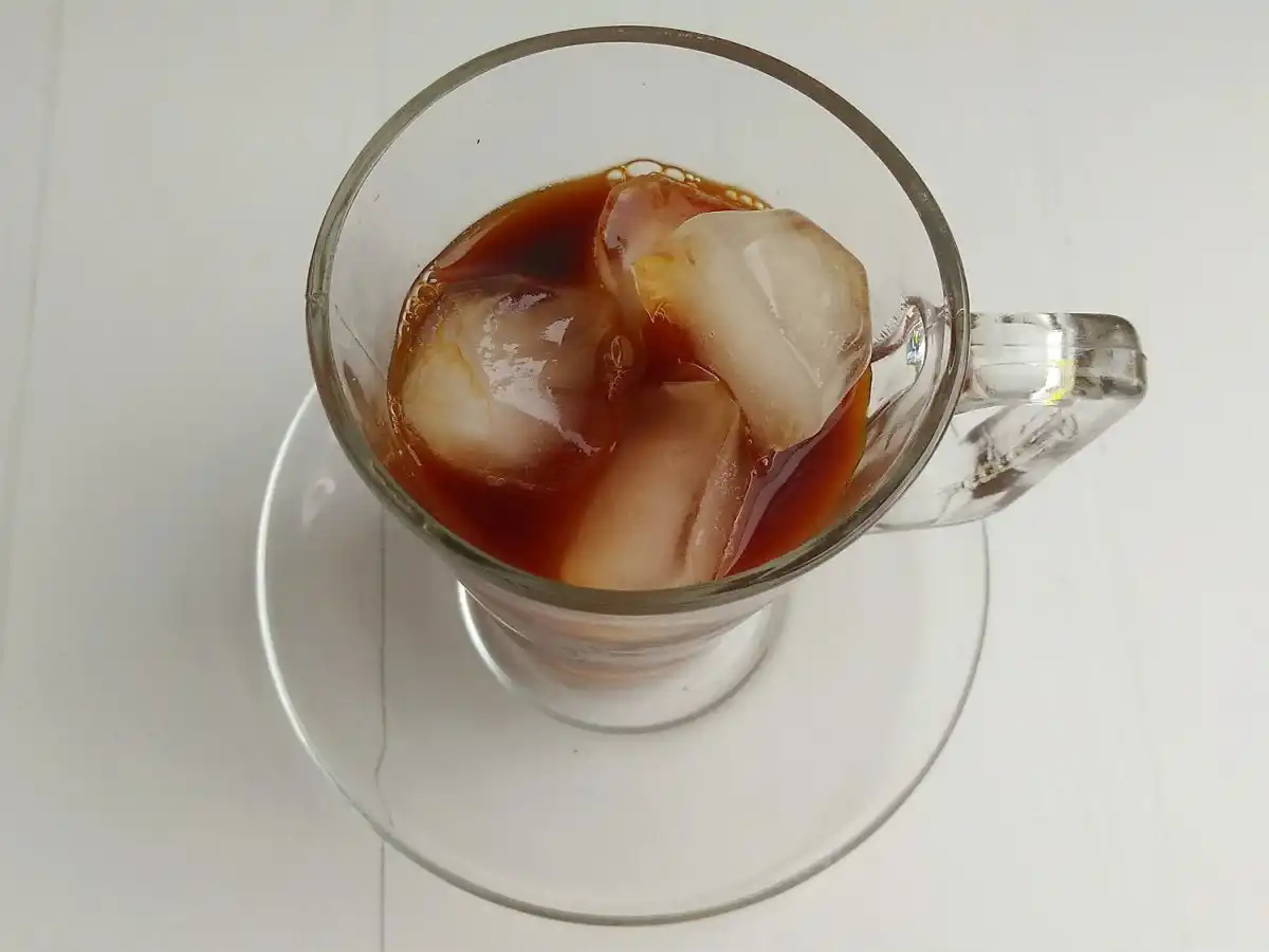 Кава разом з чаєм змолоти в кавомолці до порошкоподібного стану. Порошок викласти у турку, залити холодною водою. Варити на повільному вогні, як звичайний еспресо. Зцідити напій, охолодити до температури 30 градусів, додати мед. У склянку для подачі викласти лід, влити каву.