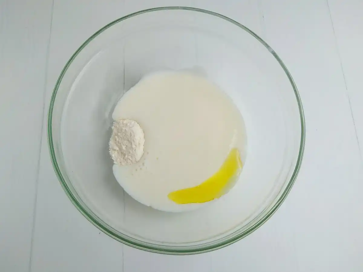 У миску для замішування тіста викласти сіль, цукор, розпушувач. Влити кефір та оливкову олію. Перемішати суміш.