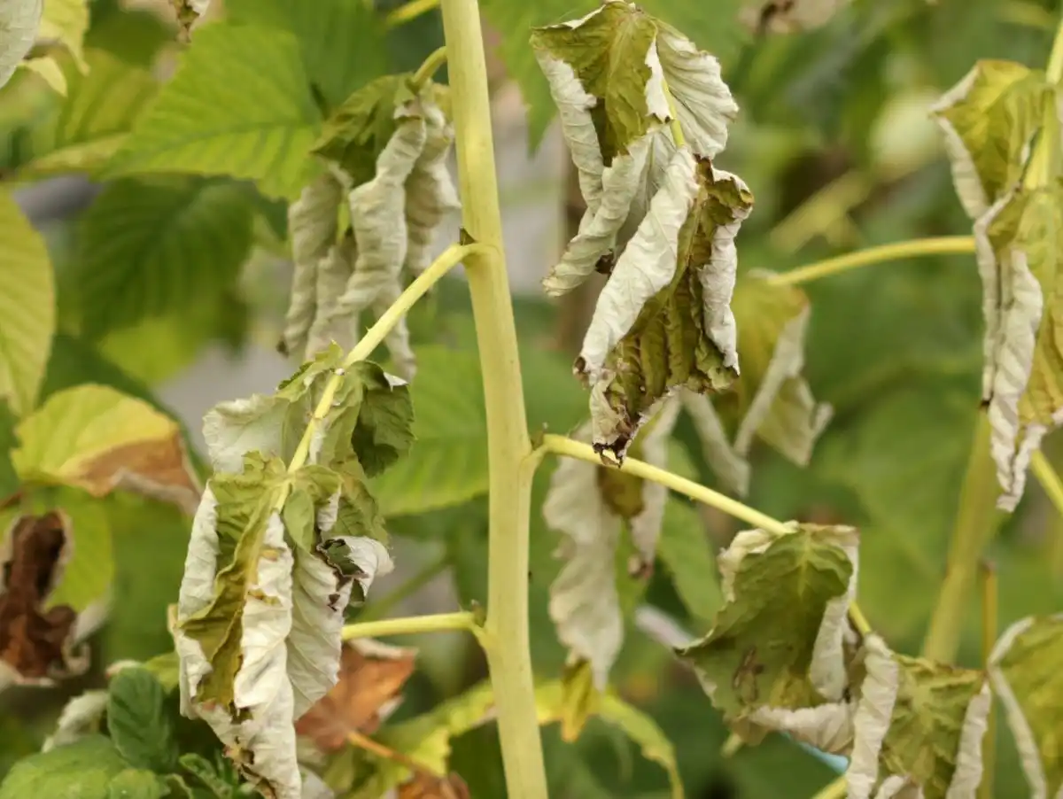 Інша назва – вертицильоз, ВІЛТ. Гриб вражає коріння рослини. Поширюючись судинною системою закупорює її. В результаті уражена коренева система малини загниє, а надземна частина в'яне і засихає.
