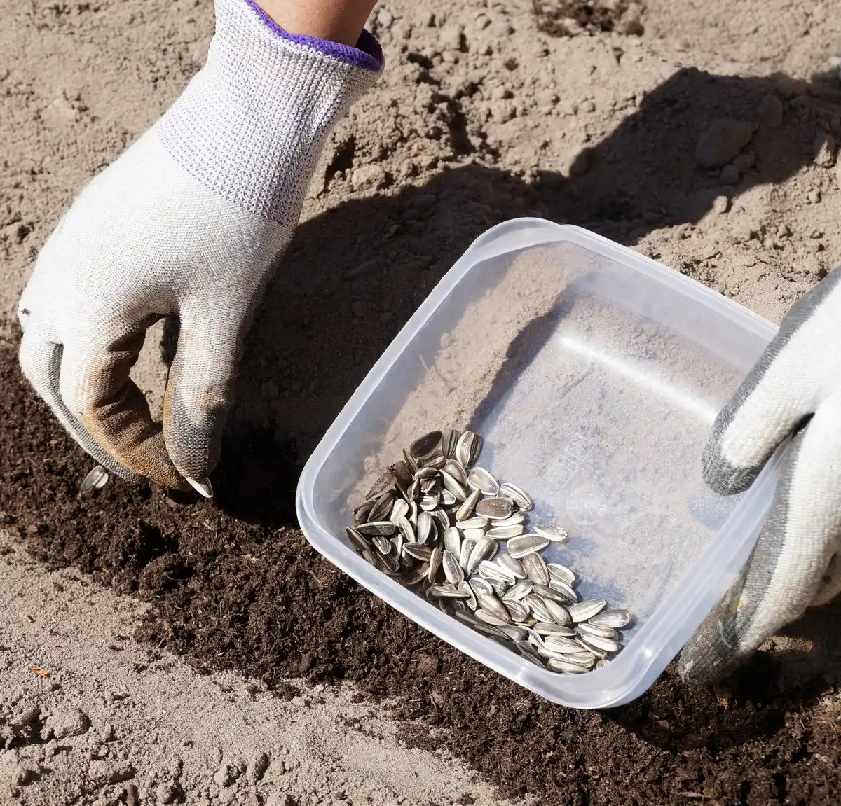 Сію соняшник сухим насінням, кладу по три насіння, бо не всі сходять. У разі, якщо проклюнеться кілька насіння, потім зрізаю зайві ножицями. Відстань між насінням роблю 25-30 см. Глибина посіву 5 см. Зазвичай я роблю борозенки потрібної глибини, не сильно ущільнюю їх (вузьким краєм дощечки, наприклад) і добре проливаю їх водою. Потім розкладаю насіння на потрібній відстані та акуратно присипаю землею.