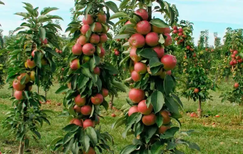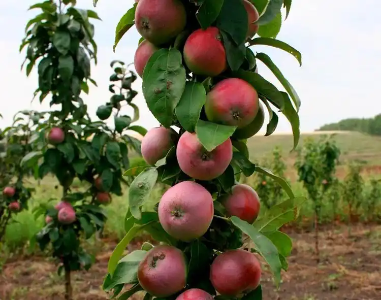 Колоноподібний тип яблунь не формує бічних гілок, росте практично в один стовбур, на якому формує плоди. Такі яблуні відрізняються скороплідністю – вже наступного року після посадки рік можна отримати перший урожай. Максимальний урожай, при правильному догляді та підборі сорту – до 20 кг із мініатюрного дерева.