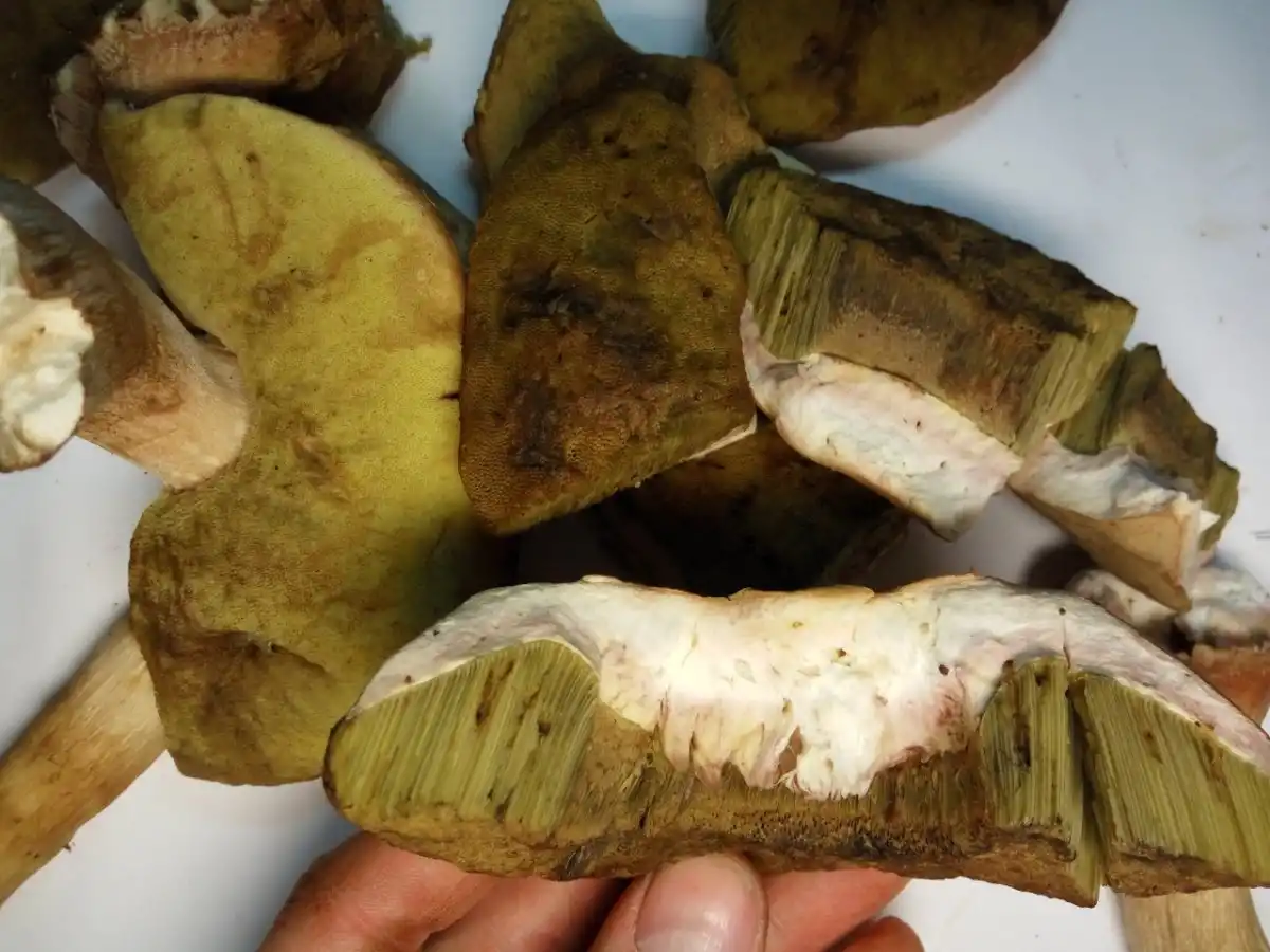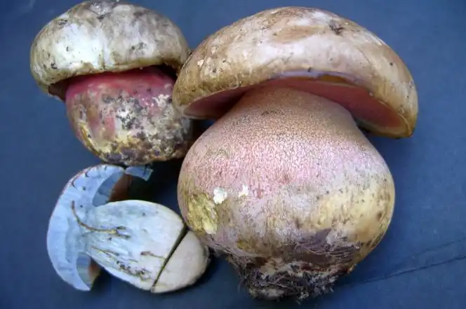 Ну, і сатанинський гриб теж при погляді зверху, а іноді і збоку можна сплутати з білим. Розріз чи надлом все ставлять на свої місця – він синіє. Не дуже сильно і не дуже швидко. І основа трубчастого шару у нього червоне. Також дуже гіркий, є відомості про його токсичність для печінки. Як і перераховані вище боровики, тяжіє на південь.