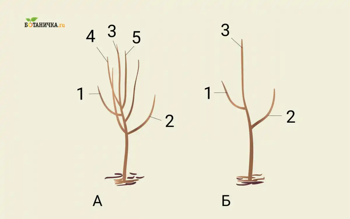 Буває, що на саджанці вже є бічні гілочки. Тоді з них на рівні вище за намічений штамб обирають кілька спрямованих у різні сторони, для утворення скелетних гілок, а все, що нижче, видаляють. Нижня частина стовбура має бути вільна від гілок, які заважатимуть збиранню врожаю, обробці землі навколо дерева.