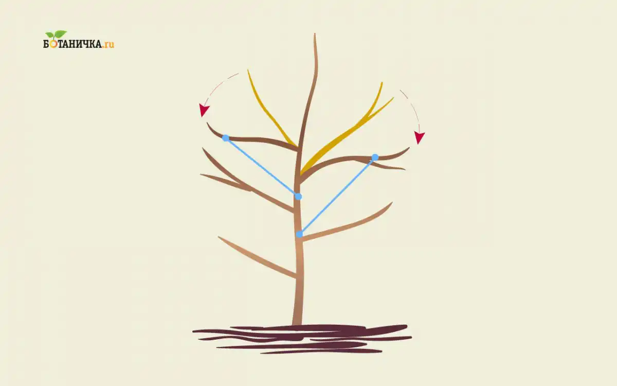 Якщо вибрані каркасні гілки яблуні мають недостатній кут нахилу або в процесі росту набувають вертикального положення, щоб зберегти їх і не втратити врожай, такі гілки відгинають за допомогою мотузки або розпірок.
