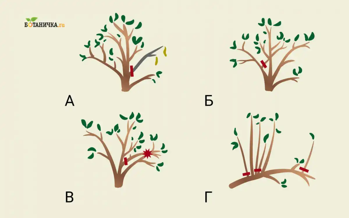 При правильному обрізанні гілок зріз виглядає наступним чином: основа зрізу збігається з нижньою стороною нирки, а верхня частина трохи вища за нирку.