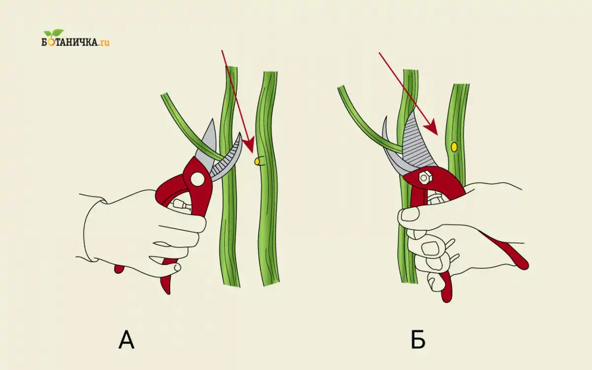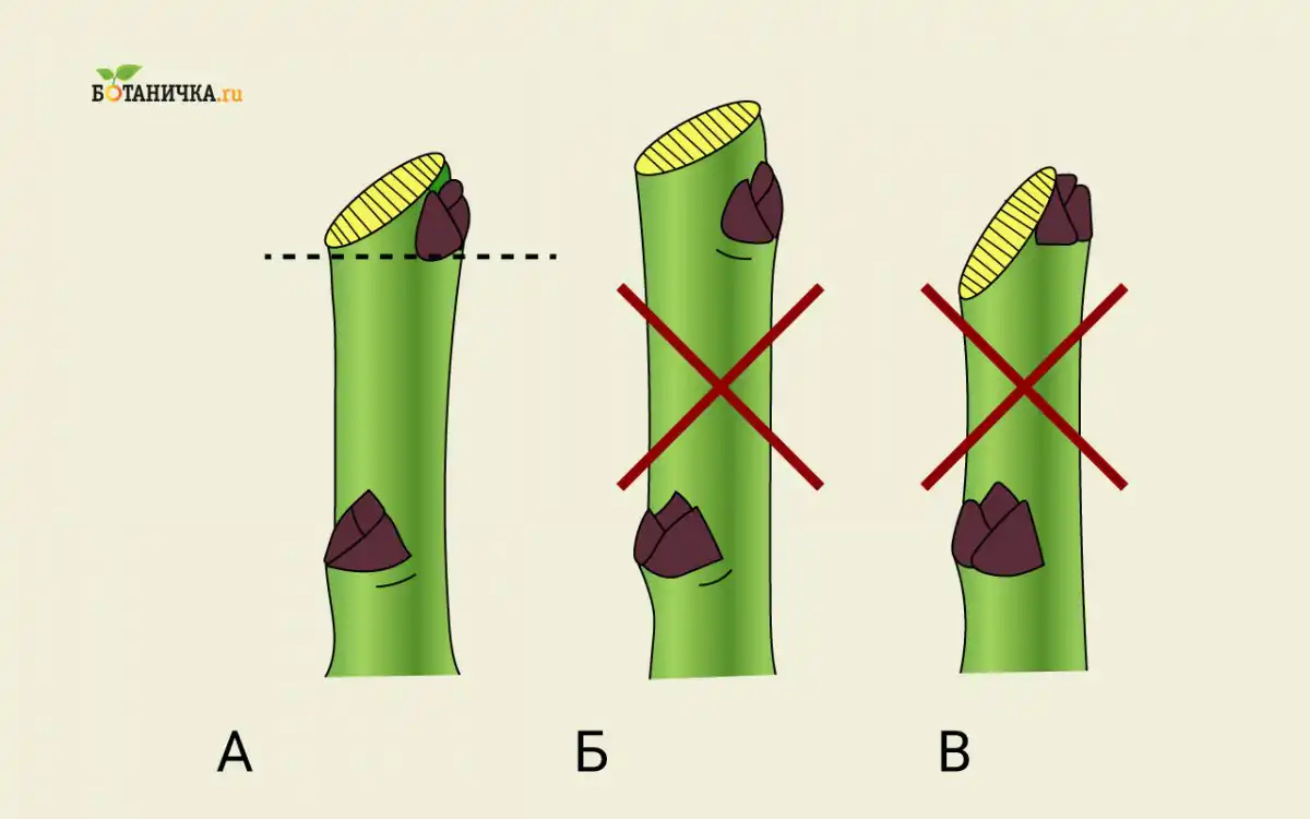 Не підрізайте надто близько над ниркою, але й не надто далеко від неї. Оболонка нирки має залишитися непошкодженою. Занадто близьке розташування зрізу над ниркою може призвести до її висихання та загибелі. Занадто далеке — ризик зараження зросте, оскільки пеньок, що залишився, над ниркою загине.