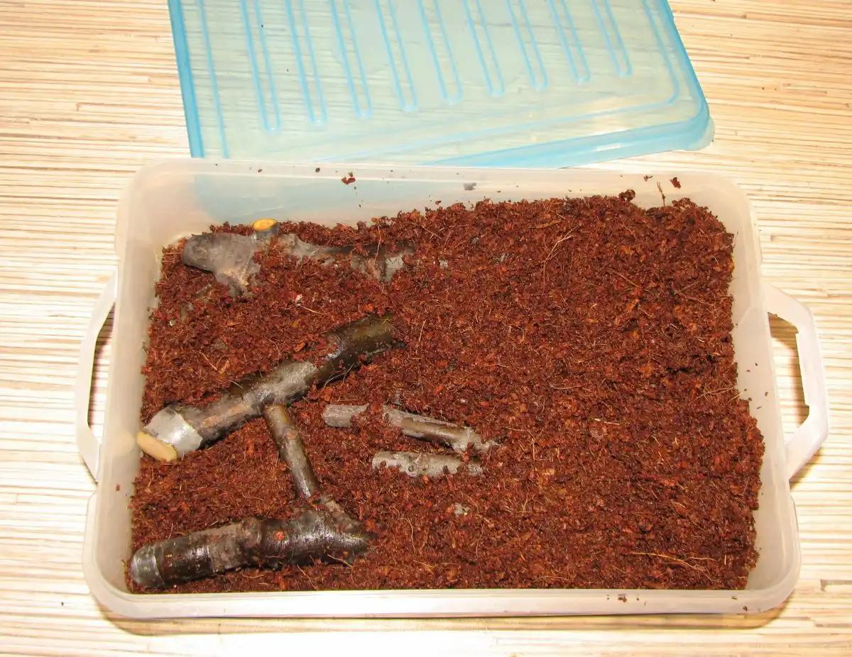 Тепер живці інжиру поміщаємо в будь-який повітропроникний і вологоємний субстрат. Хтось використовує прожарений пісок, я ж або мох сфагнум, або, як цього сезону, кокосовий субстрат. Головне, щоб він не був мокрим, і з нього не текла вода, він має бути саме вологим.