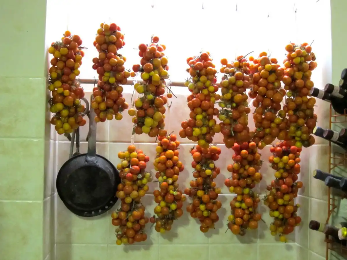 Зберігання на гілках. Сорти з гронами плодів томатів пов'язують по 2-3 гілки і розвішують на різних вішалах так, щоб вони не торкалися один одного. Їх можна розвішати у теплиці, на теплій веранді. При хорошій вентиляції термін зберігання можна збільшити до 2-3 тижнів.