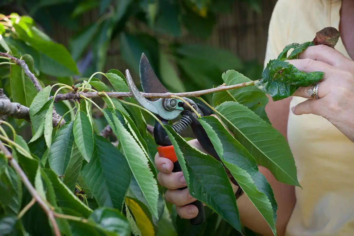 Здійснюють прищипку вручну за допомогою ножиць або секатора. Щоб не допустити передачі інфекції від зараженого дерева до здорового, після завершення роботи з одним деревом леза секатора або садових ножиць потрібно протерти ганчіркою, змоченою в спирті.