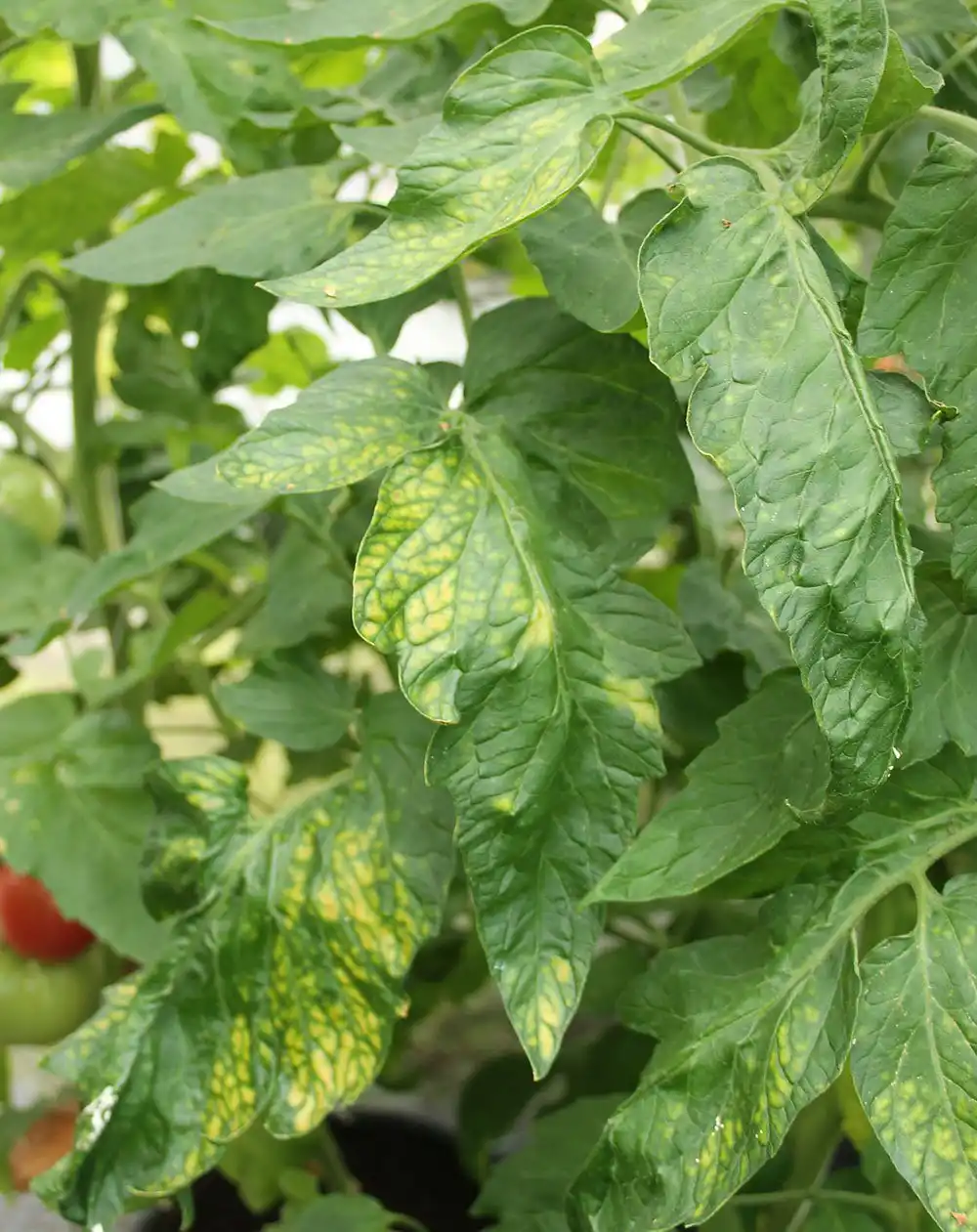 На листі томату світлі плями різноманітної конфігурації. Жилки зелені.