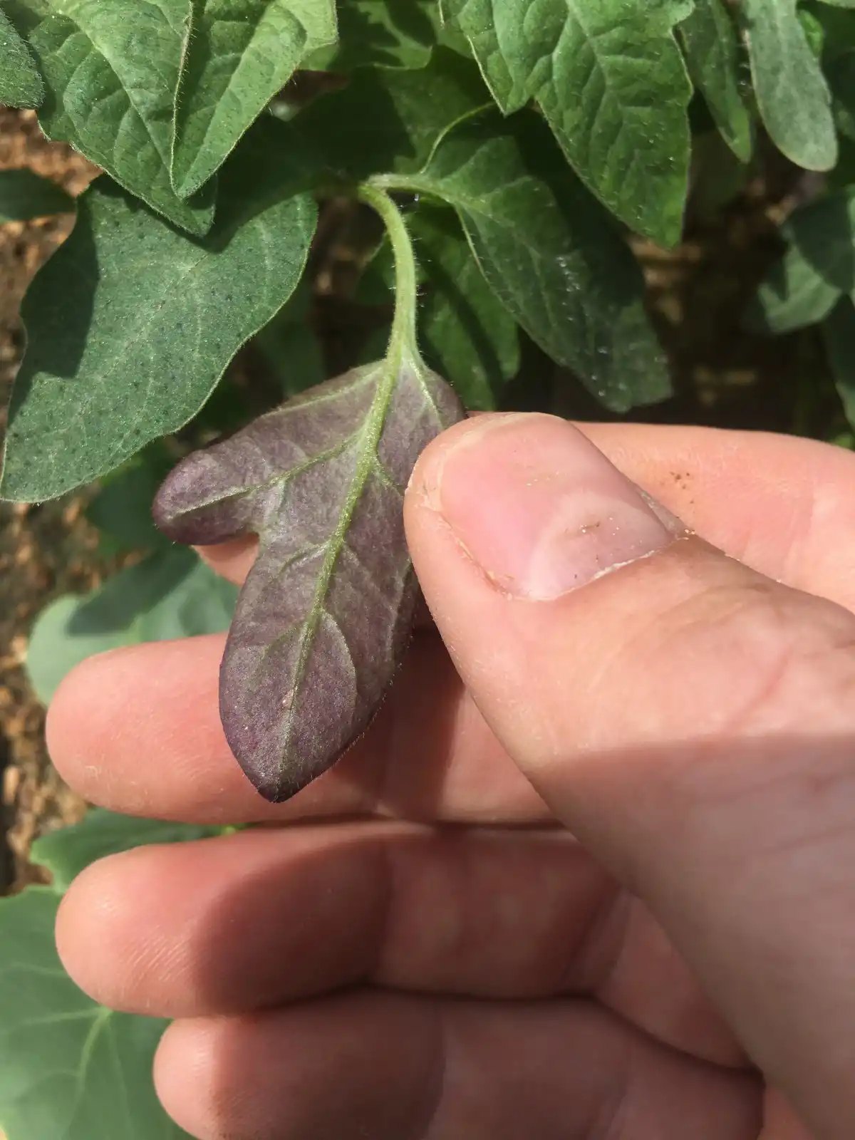 Першими висвітлюються і скручуються нижнє листя томатів. При цьому жилки з їх тильного боку набувають блакитнуватого відтінку з червоним відливом. Таке ж забарвлення з'являється і на стеблах, і на листових черешках. Стає помітною затримка у розвитку рослин. Нове листя росте дрібним, матовим, блідо-зеленим. Настає передчасне цвітіння. Утворюються дрібні плоди і, як наслідок, невеликий неякісний урожай (плоди дерев'янистими).