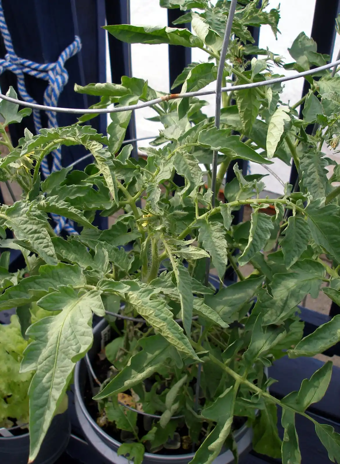Листя томату в'яле (особливо верхівкові), вибілене на кінцях, закручене в трубочку. Нові ростуть дрібними із синюватим відтінком. Пагони слабкі. Квіти опадають.