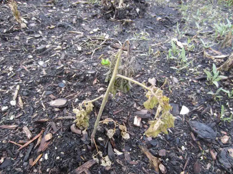 На перший погляд — безпричинне відмирання зеленого листя. Зупинка зростання. Утворення невеликої кількості квіток. Відмирання верхівки. В'янення.