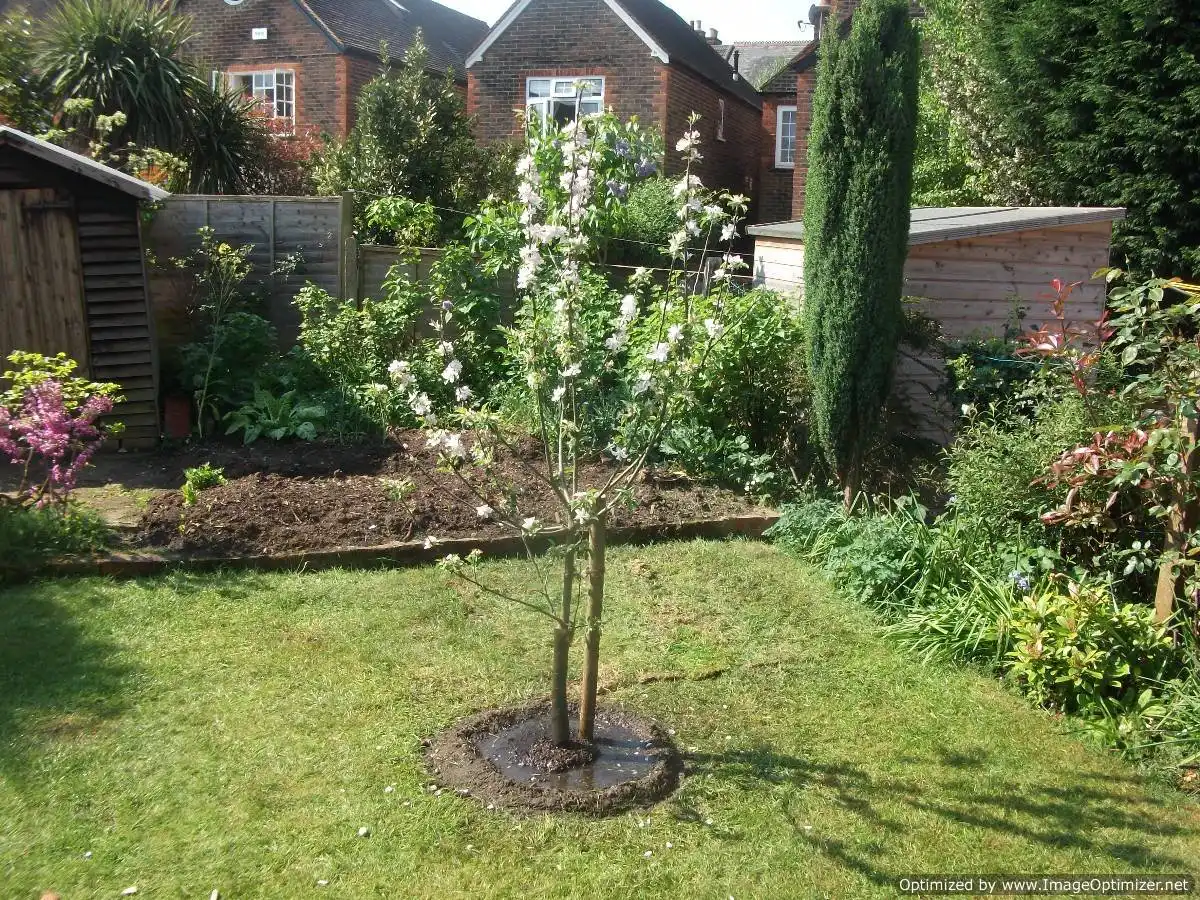 Після того як коренева система повністю присипана ґрунтом, необхідно ґрунт ущільнити, оправити дерево, щоб воно стояло вертикально, підв'язати до кілочка «вісімкою», щоб не допустити перетяжок, після чого полити ґрунт парою відер води та обов'язково замульчувати поверхню ґрунту перегноєм шаром у пару сантиметрів.