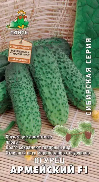 Армійський F1 – ранньостиглий партенокарпічний гібрид, що відрізняється високою стійкістю до комплексу захворювань. Характеризується дружньою віддачею врожаю. Плоди хрумкі, ароматні, відмінних смакових якостей. Ідеальні для соління та маринування.