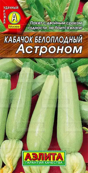 Кабачок «Астроном» - Оригінатор сорту агрофірма «Аеліта». Дозволено до посадки у четвертому – Волго-Вятському регіоні. Дозріває рано, є кущовою, слабогіллястою рослиною із середніми листовими пластинками частіше за світло-зелене забарвлення зі слабким розсіченням. Форма кабачка - циліндрична, має середню довжину і діаметр, забарвлення світло-зелене, присутні світлі плями на поверхні. Маса плода 1,2 кг. Дегустатори оцінюють смак сорту як хороший. Усередині плоду знаходиться середнє за розміром біло-молочне насіння еліптичної форми. Урожайність сягає 1293 центнерів з гектара (зафіксована у Рязанській області).