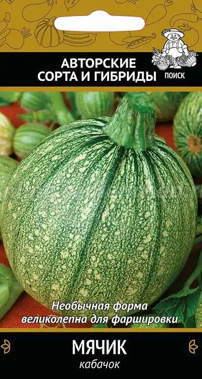 Кабачок «М'ячик» - Оригінатор сорту агрофірма «Пошук». Дозволено до посадки у другому – Північно-Західному регіоні, третьому – Центральному регіоні, а також п'ятому – Центрально-Чорноземному регіоні. Дозріває рано, є кущовою, середньогіллястою рослиною із середніми листовими пластинками частіше за світло-зелене забарвлення з сильним розсіченням і ледь помітними плямами. Форма кабачка - куляста, він має білувате забарвлення, присутні світлі плями на поверхні. Маса плоду близько 2,1 кг. Дегустатори оцінюють смак сорту як добрий. Усередині плоду знаходиться середнє за розміром біло-молочне насіння еліптичної форми. Урожайність сягає 1406 центнерів з гектара (зафіксована у Рязанській області).