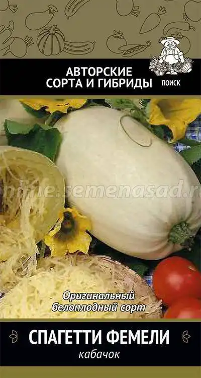 Кабачок «Спагетті Фемелі» - Оригінатор сорту агрофірма «Пошук». Дозволено до використання у третьому – Центральному регіоні. Дозріває в середні терміни, є рослиною типу спагетті, напівплетистим, із середніми листовими пластинками частіше за зелене забарвлення з сильним розсіченням. Форма кабачка - еліптична, в молодому віці він має білувате забарвлення, в стиглому - світло-зелене, з помітною плямистістю, дуже короткий з великим діаметром. Щільність м'якуша сорту висока, вона дуже соковита, волокниста з невеликим вмістом цукру. Маса кабачка складає 1,6 кг. Дегустатори оцінюють смак як добрий. Усередині плоду знаходиться середнє, біло-молочне насіння еліптичної форми. Урожайність досягає 975 центнерів із гектара.