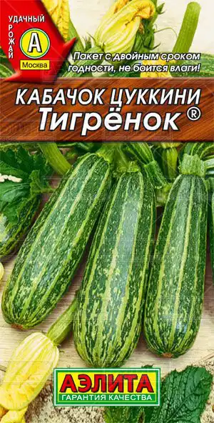 Кабачок «Тигреня» - Оригінатор сорту агрофірма «Аеліта». Допущений до використання Російською Федерацією. Дозріває рано, є кущовим, слабогіллястим рослиною з невеликими, сильно розсіченими листовими пластинками, покритими помітною білуватою плямистістю. Форма кабачка - циліндрична, він має вигнуту форму, діаметр невеликий, забарвлення темно-зелена, присутні світлі плями і ребристість на поверхні. М'якуш дуже ніжний, проте щільний, світло-кремовий. Маса кабачка 1,3 кг. Усередині плоду знаходиться біло-молочне насіння еліптичної форми. Урожайність досягає 7,5 кілограмів із квадратного метра. Із позитивних якостей сорту слід виділити його високу посухостійкість.