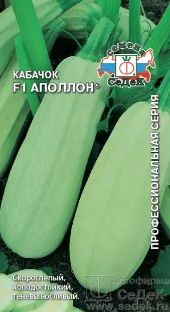 Кабачок "Аполлон F1" - Оригінатор гібрида агрофірма «СеДеК». Дозволено до використання у третьому – Центральному регіоні, а також п'ятому – Центрально-Чорноземному регіоні. Дозріває рано, є кущовим, компактним рослиною із середніми листовими пластинками частіше зеленого забарвлення з сильним розсіченням і ледь помітними плямами. Форма кабачка в технічній стиглості – циліндрична, він слаборебристий має середню довжину, сіро-зелене забарвлення, є світлі, точкові плями на поверхні. М'якуш досить щільний, але ніжний. Маса плода 1,4 кг. Дегустатори оцінюють смак гібрида як добрий. Усередині плоду знаходиться дуже велике біло-кремове насіння еліптичної форми. Урожайність сягає 1039 центнерів із гектара.
