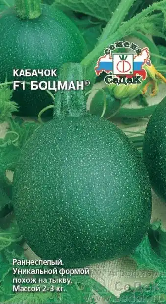 Кабачок "Боцман F1" - Оригінатор гібрида агрофірма «СеДеК». Дозволено до використання у третьому – Центральному регіоні, а також п'ятому – Центрально-Чорноземному регіоні. Дозріває рано, є кущовим, компактним рослиною із середніми листовими пластинками частіше зеленого забарвлення з сильним розсіченням і ледь помітними плямами. Форма в технічній стиглості - широкоеліптична, ребристість виражена слабо, він дуже короткий, діаметр плода великий, забарвлення темно-зелене. Щільність м'якуша кабачка висока, проте вона дуже ніжна. Маса плода 1,3 кг. Дегустатори оцінюють смак гібрида як добрий. Усередині плоду знаходиться середнє за розміром, біло-кремове насіння еліптичної форми. Урожайність досягає 1065 центнерів із гектара.